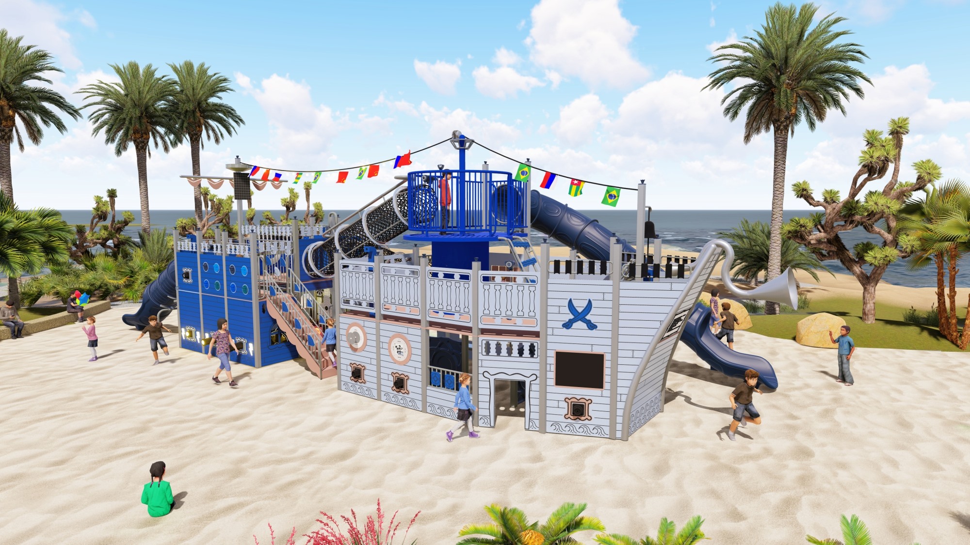 木质海盗船组合滑梯的设计以大自然为主题,融合了船体、桅杆、甲板等元素,外观新颖、结构牢固。它集攀爬、滑梯、秋千等功能于一体,旨在锻炼孩子的平衡协调能力和自我保护意识,同时培养探险精神。