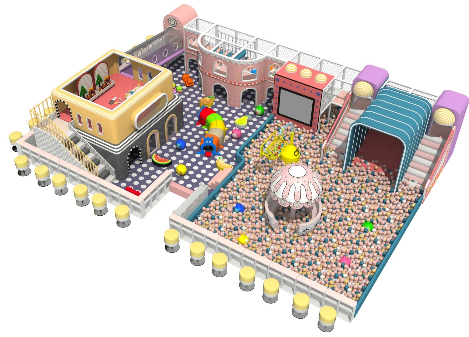 • 室内淘气堡又称室内儿童乐园,是针对儿童生理能力与心理特点喜欢钻、爬、滑、滚、晃、荡、跳、摇等玩耍动作而设计的综合性室内休闲娱乐场所。kaiyun开云游乐淘气堡项目具有多样性、互动性和安全性的特点,儿童在玩乐的同时能培养独立的个性,团队协作能力,沟通能力、克服困难、积极进取的精神,锻炼身体、健脑益智。